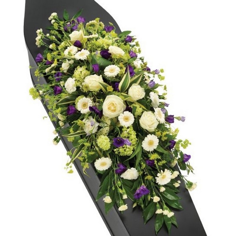 A coffin spray made of seasonal flowers in purples and whites. This tribute can be made in various colours of your choice, please telephone your personal requirements.
