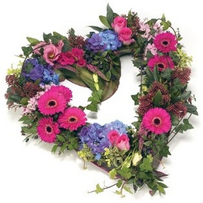 A beautiful loose heart design in blue, cerise and pale pinks.